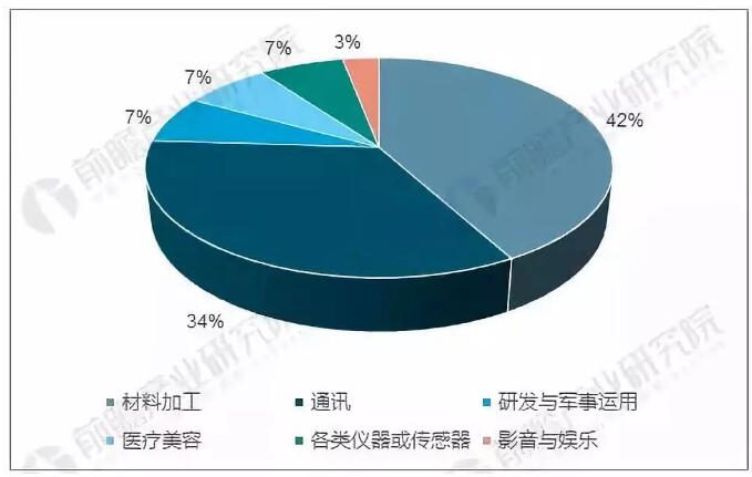 激光器用途十分广泛,目前主要应用于通讯、材料加工、研发与军事运用、医疗美容等领域。根据数据,2017 年,全球激光器行业应用领域中材料加工相关的激光器收入51.66亿美元,占全球激光器收入的42%,超越通讯领域成为第一大激光器应用领域;研发与军事运用相关激光器收入9.22 亿美元,占全球激光器收入的7%;医疗美容相关激光器收入9.20亿美元,占全球激光器的7%。