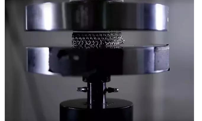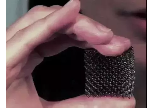 除了其超低密度结构,微格金属的多孔设计产生特殊的金属机械性能,压缩体积变小50%张力之后,仍然能够完全恢复原形,具有超级高能量吸收能力。因为它其中的金属微点阵是由相互连接的空心支柱组成;每支柱的直径~100μm,壁后100nm,全部结构的99.99%为空气;表观密度为0.9g/cm3,是一种合成的多孔极轻3D开放式蜂窝聚合物结构金属材料。这种创新材料比泡沫塑料还要轻100倍,和骨骼的构造差不多(骨骼的外部非常坚硬,但是其内部实际上大部分都是蜂窝状空心结构)。因此它们很不容易折断而且重量非常小。