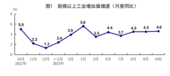 10月份,全国规模以上工业增加值同比增长4.6%,比上月加快0.1个百分点;环比增长0.39%。分三大门类看,采矿业增加值同比增长2.9%,制造业增长5.1%,电力、热力、燃气及水生产和供应业增长1.5%。装备制造业增加值同比增长6.2%,比上月加快0.7个百分点,连续3个月回升。分经济类型看,国有控股企业增加值同比增长4.9%;股份制企业增长5.6%,外商及港澳台商投资企业增长0.9%;私营企业增长3.9%。分产品看,太阳能电池、服务机器人、集成电路产品产量同比分别增长62.8%、59.1%、34.5%。1-10月份,全国规模以上工业增加值同比增长4.1%。1-9月份,全国规模以上工业企业实现利润总额同比下降9.0%,降幅比1-8月份收窄2.7个百分点,其中9月份同比增长11.9%。10月份,制造业采购经理指数为49.5%,企业生产经营活动预期指数为55.6%。