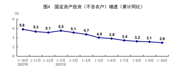 1-10月份,全国固定资产投资(不含农户)419409亿元,同比增长2.9%,比1-9月份回落0.2个百分点。分领域看,基础设施投资同比增长5.9%,制造业投资增长6.2%,房地产开发投资下降9.3%。全国商品房销售面积92579万平方米,同比下降7.8%;商品房销售额97161亿元,下降4.9%。分产业看,第一产业投资同比下降1.3%,第二产业投资增长9.0%,第三产业投资增长0.4%。民间投资下降0.5%,降幅比1-9月份收窄0.1个百分点;扣除房地产开发投资,民间投资同比增长9.1%。高技术产业投资同比增长11.1%,其中高技术制造业和高技术服务业投资分别增长11.3%、10.5%。高技术制造业中,航空、航天器及设备制造业,医疗仪器设备及仪器仪表制造业投资分别增长19.0%、16.7%;高技术服务业中,科技成果转化服务业、专业技术服务业投资分别增长37.3%、29.1%。10月份,固定资产投资(不含农户)环比增长0.10%。