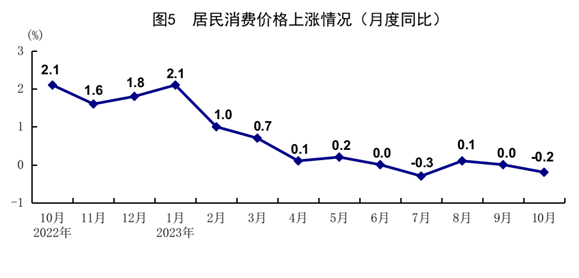 10月份,全国居民消费价格(CPI)同比下降0.2%,环比下降0.1%。分类别看,食品烟酒价格同比下降2.1%,衣着价格上涨1.1%,居住价格上涨0.3%,生活用品及服务价格下降0.6%,交通通信价格下降0.9%,教育文化娱乐价格上涨2.3%,医疗保健价格上涨1.3%,其他用品及服务价格上涨3.6%。在食品烟酒价格中,猪肉价格下降30.1%,鲜菜价格下降3.8%,粮食价格上涨0.6%,鲜果价格上涨2.2%。扣除食品和能源价格后的核心CPI同比上涨0.6%。1-10月份,全国居民消费价格同比上涨0.4%。