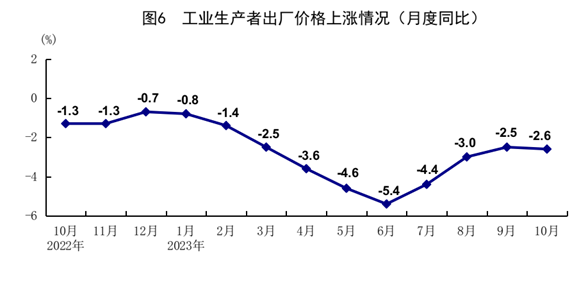 10月份,全国工业生产者出厂价格同比下降2.6%,环比持平。全国工业生产者购进价格同比下降3.7%,环比上涨0.2%。1-10月份,全国工业生产者出厂价格和购进价格同比分别下降3.1%和3.6%。