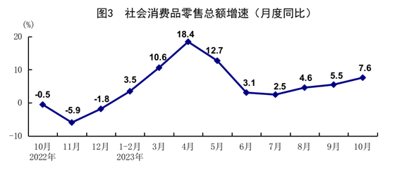 10月份,社会消费品零售总额43333亿元,同比增长7.6%,比上月加快2.1个百分点;环比增长0.07%。按经营单位所在地分,城镇消费品零售额37479亿元,同比增长7.4%;乡村消费品零售额5854亿元,增长8.9%。按消费类型分,商品零售38533亿元,增长6.5%;餐饮收入4800亿元,增长17.1%。在限额以上单位商品零售额中,体育、娱乐用品类,通讯器材类,汽车类,金银珠宝类商品零售额分别增长25.7%、14.6%、11.4%、10.4%。1-10月份,社会消费品零售总额385440亿元,同比增长6.9%。全国网上零售额122915亿元,同比增长11.2%。其中,实物商品网上零售额103010亿元,增长8.4%,占社会消费品零售总额的比重为26.7%。1-10月份,服务零售额同比增长19.0%,比1-9月份加快0.1个百分点。