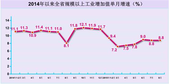 2015年8月份,我省规模以上工业增加值同比实际增长8.8%(以下增加值增速均为扣除价格因素的实际增长率),1-8月,规模以上工业增加值同比增长8.5%,均与上月持平。