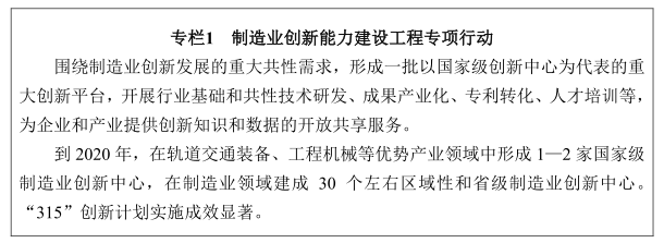 2、建设完善创新体系。完善以企业为主体、市场为导向、政产学研用相结合的制造业创新体系。一是积极创建国家制造业创新中心,加大区域、地方、企业等多层次创新中心建设。加快国家级和省级企业技术中心、工程(技术)研究中心、重点实验室等创新平台的发展,鼓励省级中心创建国家技术创新示范企业。鼓励有条件的企业在境外通过新建、入股、并购等方式建立研发机构、技术中心。到2020年,培育形成100家国家级企业技术中心、技术创新示范企业,600家省级企业技术中心。二是促进协同创新,深化省校(院、所)产学研合作,围绕制造业关键领域,支持高校、科研机构联合企业共同承担国家各类重大科技计划和产业化专项。发挥行业骨干企业的主导作用和高等院校、科研院所基础作用,推进产业创新联盟建设和博士后科研工作站建设,开展产学研用协同创新。三是推进公共服务平台建设。建设一批促进制造业协同创新的公共服务平台,力争建成国家中部技术产权交易平台。规范相关服务标准,提高技术研发、检验检测、技术评价、技术交易、质量认证、人才培训等专业化服务水平,建立重点制造领域数据库,为企业提供创新知识和工程数据的开放式共享服务平台。