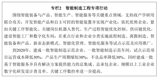 (二)大力推进智能制造,深化两化深度融合。实施"智能制造工程"专项行动,围绕流程制造、离散制造、智能装备和产品、新业态新模式、智能化管理、智能化服务等关键环节,突出新一代信息技术产业、高档数控机床和机器人、先进轨道交通装备、工程机械等重点领域,着力实现全省智能制造重点突破、面上提升,加快智能制造发展。