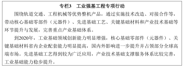 (三)发挥整机带动作用,夯实制造产业基础。实施"工业强基工程"专项行动,着力实现制约我省制造业特别是重点装备制造业发展的核心基础零部件(元器件)、先进基础工艺、关键基础材料和产业技术基础(简称"四基")的工程化、产业化突破,构建整机牵引与基础支撑协调发展的产业格局。