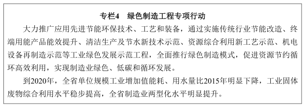 --绿色制造加快推广,持续发展能力进一步增强。制造业绿色发展水平显著提升,重点行业单位工业增加值能耗、物耗及污染物排放达到国内先进水平。冶金、化工、建材等传统行业能耗的主要技术经济指标大部分达到国内先进水平。全省规模以上单位工业增加值能耗比2015年下降18%、二氧化碳排放量比2015年下降22%、用水量比2015年下降23%,工业固体废物综合利用率达到75%。