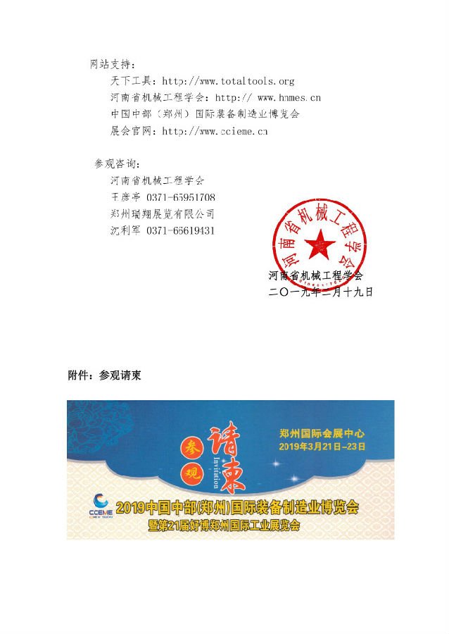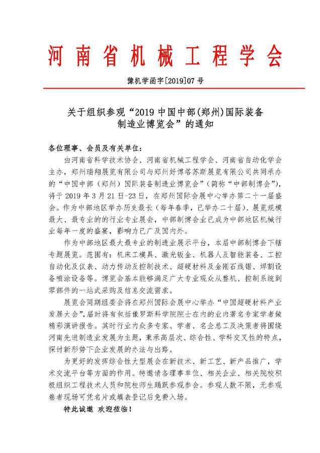 关于组织参观“2019中国中部(郑州)国际装备制造业博览会”的通知!!!