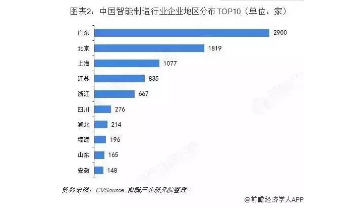 从企业地区分布来看,中国智能制造企业在地域分布方面存在明显差异,普遍分布在一线城市,广东省以绝对优势领跑市场。