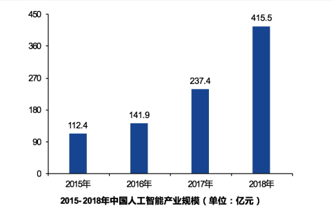 中国人工智能产业规模超400亿。近年来,中国人工智能产业发展迅速,跟据中国信通院数据,2015年到2018年中国人工智能产业规模复合平均增长率为54.6%,高于全球平均水平(约36%)。