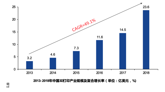 3D打印——崛起中的智能制造方式。3D打印不仅仅是炫酷的前沿科技,更是有望革新制造业的“潜力股”。其集合了大规模生产的高效和手工生产的灵活等优点,制造业的全流程都可以引入3D打印,能实现制造过程的高效率和低成本,代表了智能制造的未来发展方向。近年来,我国3D打印行业发展迅速,从2013年3.2亿美元的市场规模发展到2018年的23.6亿美元,5年的复合增长率达到49.1%。