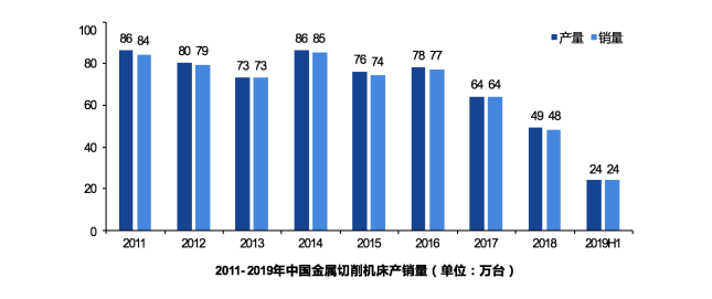金属切削机床是目前主流的机床产品,全球销量占全部机床的比例达到52.48%,金属切削机床不仅可以应用于电力、船舶、航天航空等领域,还可用于电子、汽车、新能源、纺织等行业的自动化设备制造中。在经历了2011-2017的震荡波动后,受汽车、3C等主要下游行业景气度下滑及固定资产投资增速持续疲软影响,我国机床增量市场持续萎缩,2018年我国金属切削机床产销同比分别下降24%和25%,2019年上半年均同比下降了10%左右。