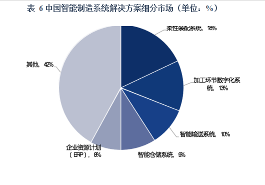 受益于用户数字化建设的持续推进,用于研发、物流、服务等环节的智能制造系统解决方案也在加强,相关环节智能制造系统解决方案的应用比例有所提升。排名前五位的智能制造系统解决方案的是:柔性装配系统、加工环节数字化系统、智能输送系统、智能仓储系统以及企业资源计划(ERP),占比分别为18%、13%、10%、9%、8%。