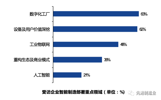 根据德勤调查发现,中国工业企业智能制造五大部署重点依次为:数字化工厂(63%)、设备及用户价值深挖(62%)、工业物联网(48%)、重构生态及商业模式(36%)以及人工智能(21%)。从相关技术来看,受访企业所关注的相关技术包括工业软件、传感器技术、通信技术、人工智能、物联网、大数据分析等。