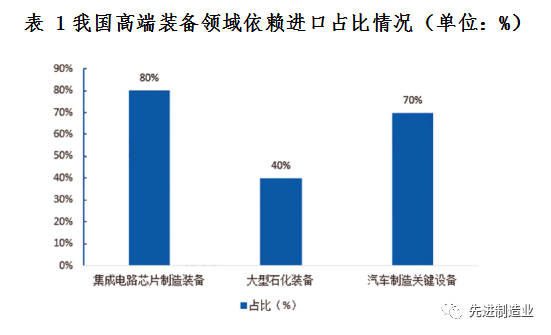 虽然目前我国已经成为制造业大国,但“大而不强”依然是困扰我国制造业发展的主要矛盾,据中国机械工业联合会的数据显示,在高端装备领域,我国80%的集成电路芯片制造装备、40%的大型石化装备、70%的汽车制造关键设备及先进集约化农业装备仍然依靠进口。