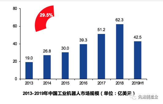 中国工业机器人发展较快,约占全球市场份额三分之一,连续六年成为全球第一大应用市场。2018年,中国工业机器人产量达到14.8万台,占全球产量的38%以上。受制于下游行业的需求放缓——汽车行业迎来28年首次销量下滑,3C行业增长也大幅度回落,2019年上半年,整个行业订单增长疲软,产量持续下滑,仅为7.5万台,下降幅度为10.1%。但根据中国电子学会数据显示,2019年上半年全球机器人市场规模达144亿美元,其中中国机器人市场规模达42.5亿美元,占比达到29.5%,在全球仍扮演者重要角色。