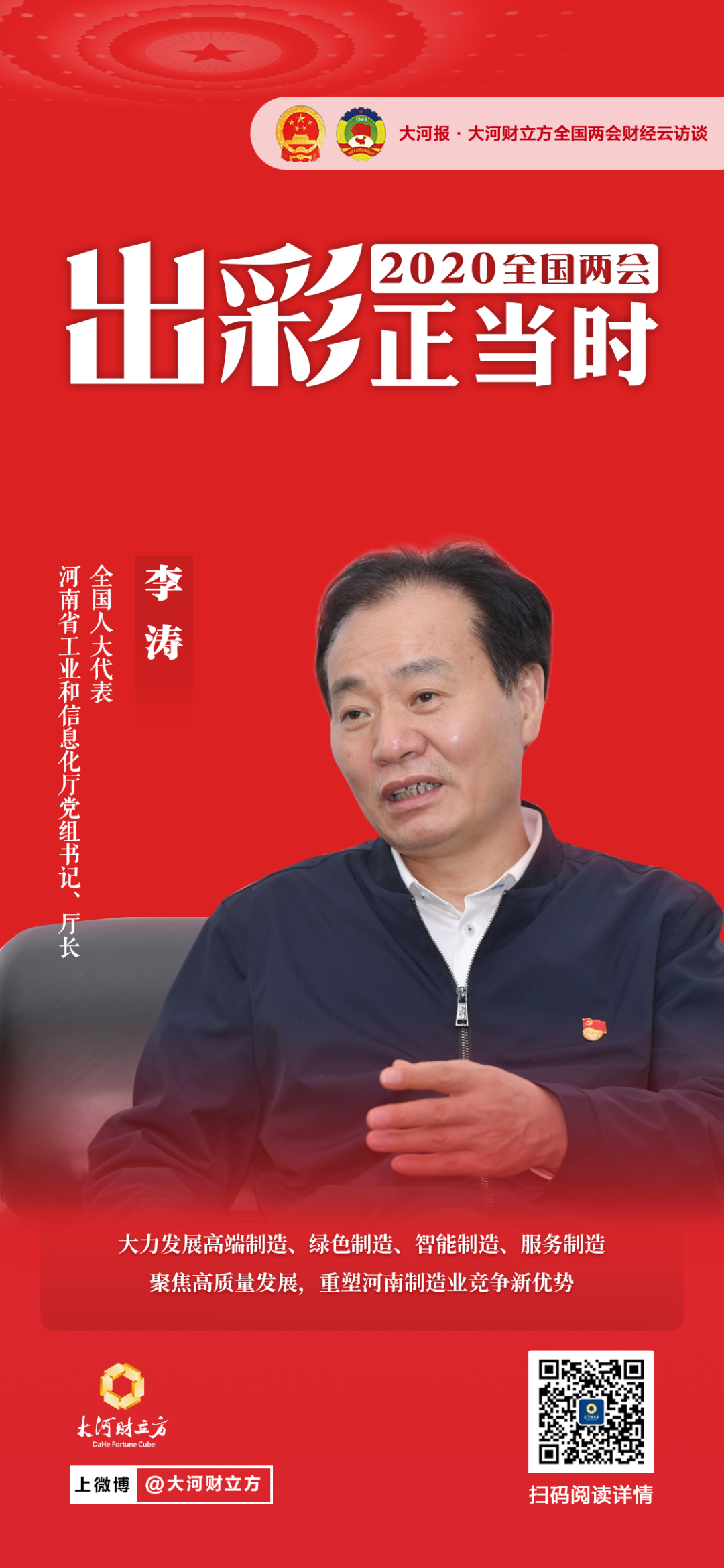 “在本次抗击新冠肺炎疫情过程中,河南依靠制造业基础优势,为疫情防控供应了大量的防疫物资,彰显了河南制造业的担当。”在十三届全国人大三次会议召开之际,全国人大代表,河南省工业和信息化厅党组书记、厅长李涛接受大河报·大河财立方《极刻》专访时表示,制造业作为河南经济发展的支柱产业,是推动经济高质量发展的关键和重点。
