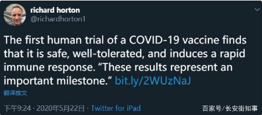 同一时间,《柳叶刀》主编理查德·霍顿通过社交媒体分享了这则消息,并赞叹:首次对此新冠病毒疫苗的人体实验结果发现,它具有良好的安全性和耐受性,并且能够诱导快速的免疫反应。“这些结果代表着一个重要的里程碑。”