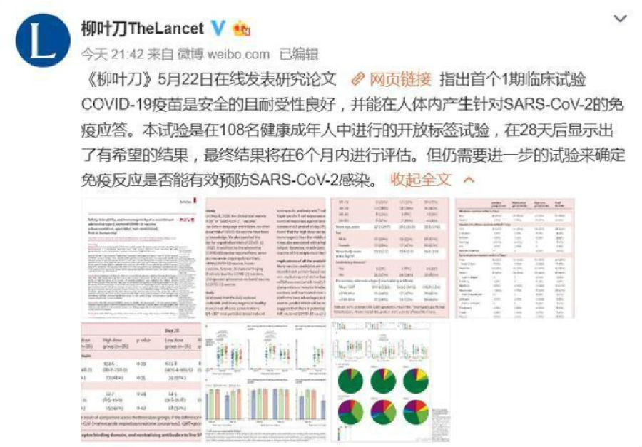 《柳叶刀》也通过其官方微博称:首个1期临床试验COVID-19疫苗是安全的且耐受性良好,并能在人体内产生针对SARS-CoV-2的免疫应答。