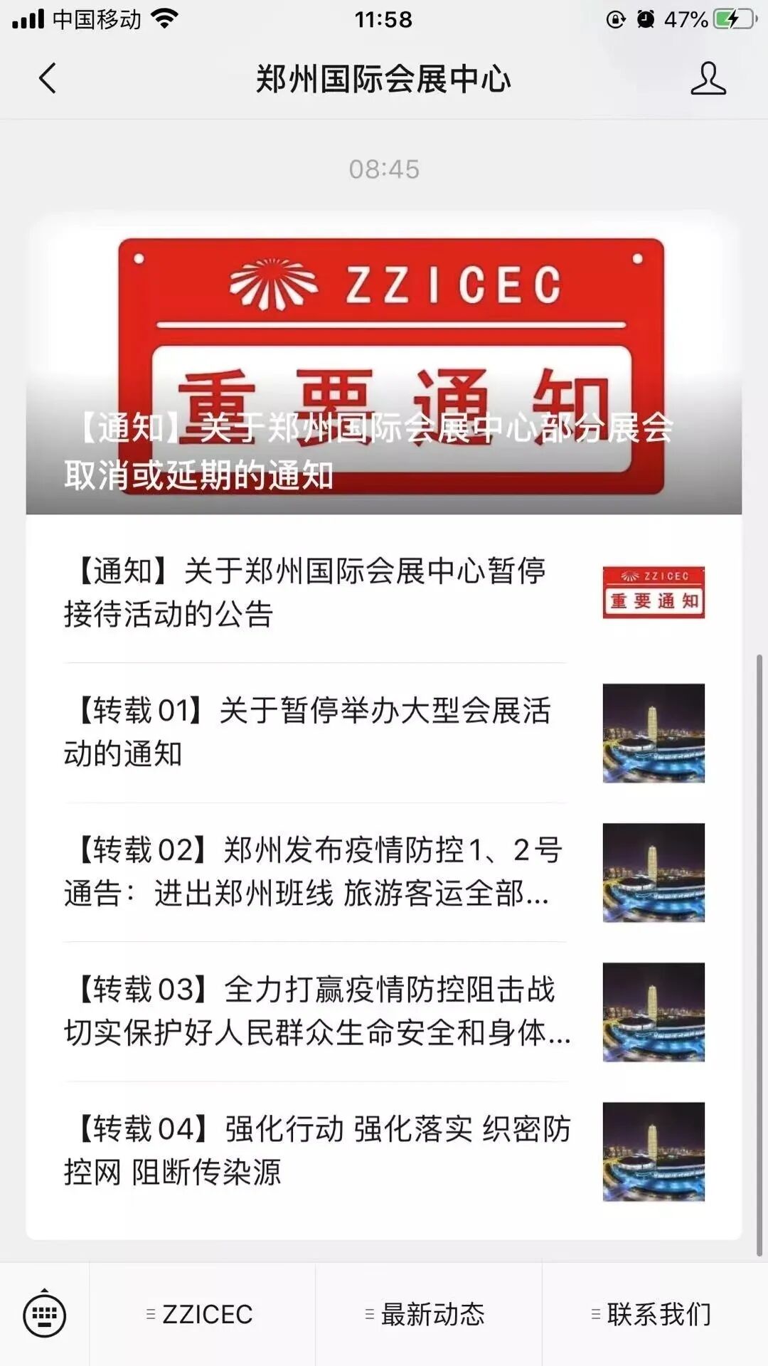 1月28日,郑州国际会展中心反应迅速并做出部署安排。与展会主办方积极沟通协调,确定对部分展会进行延期和取消,并暂停了展馆的参观接待活动。