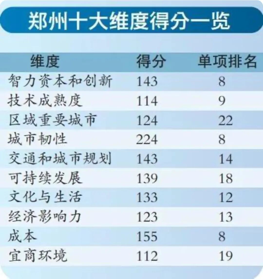 实际上,对比2018年的报告来看,郑州并非首次进入前十▼ 《机遇之城2018》报告中,在当年调研的26座城市中,郑州居第10位。但当年的报告26座城市中没有北上广深。 而从连续3年的报告来看,郑州在今年首次反超长沙和西安,且其和邻居城市武汉差距缩小。 郑州位次的提升,得益于城市韧性、智力资本和创新、交通和城市规划等主要纬度。 普华永道北京分公司综合商务咨询主管合伙人于勃告诉记者▼ 在2020年上半年疫情期间,郑州的战“疫”效果为郑州进入前十增色,这也让郑州在城市韧性指标上大幅领先长沙和西安。 包括医疗设施、医师资源、养老保险、卫生健康财政投入、公共安全财政投入等8个细分项,其中郑州医疗设施评分排在全国首位。 郑州略微领先长沙和西安,其他指标上三者几乎不相上下。于勃还提到,在智力资本和创新纬度上,郑州以143分排在靠前位置,在42个城市中居于中等偏上。 郑州得分114(最高分158),相对也是较高的得分。这个指标主要体现在移动支付和数字经济使用情况上。 国内外游客、星级酒店数量、国际航班等,构成了区域重要城市纬度▼ 从榜单来看,得分最高的为上海(239分),而郑州得分为124,低于西安(165)、长沙(148)、武汉(191)和成都(195)。 据于勃介绍,从诸多指标来看,中部周边六省会城市在区域重要城市这个指标上,郑州和武汉、成都有一定的差距,有比较大的提升空间▼ 细分来看,郑州目前没有本土客运航空公司。不过郑州的货运航空公司正在增加,比如国资控股的中原龙浩,以及今年首次面世的本土民营货航中州航空。 另外,在经济影响力上,河南经济发展很快,但河南很多传统龙头企业在转型过程中,新兴企业还不是特别多,在这个维度郑州也有很大的发展潜力。